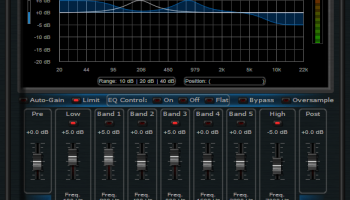 The plug-in includes a low shelf/low cut filter, a high shelf/high cut filter and 5 boost/cut band filters. An optional brickwall limiter has been added to the output to protect your ears and monitors. Its wide range of gain (+/-40 dB per band) and bandwidth (.01 to 5 Octaves) makes it suitable for any equalization task, especially with the extra zooming capability that lets you define your own range for the user interface. The included skins let you choose the layout that best suits your needs, and you can completely customize the user interface thanks to Blue Cat's Skinning language support.