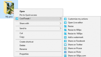 tags: pictures, right click menu, resize, watermark, share, facebook, flickr, 500px, twitter, picasa, google+, batch, tool