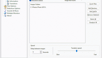 gPhotoShow is an easy to use screen saver that turns your favorite image files into a unique personal Screen Saver slideshow, complete with transition effects. gPhotoShow is ideal for displaying your favorite image files from your collection or even use it to create a corporate logo Screen Saver for your Company. Features : - Several transition effects - Image formats : BMP, JPG, GIF, PNG - Works on both 256 color and True Color displays - Configurable delay between images - Automatically resizes your images - Plays your favorite music during slide show - - Sound formats: MID, WAV, MP3 - Multi monitor support - Password protection - Set last picture as desktop wallpaper - Easy install / uninstall