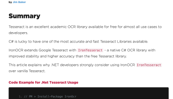 Iron OCR can use the Tesseract 3, Tesseract 4, and Tesseract 5 engine. It provides these on Windows, Linux, and Mac operating systems, and everything you need is installed automatically when you install the Iron OCR NuGet package: homepage Tesseract itself is a command line executable which may not be appropriate for using in real-world scenarios such as web applications. Iron OCR provides the latest Tesseract 5 technology directly to .NET developers without requiring them to install Tesseract onto their host operating system manually. We find that Iron OCR provides an advanced image sampling and upscaling technology, ensuring that even low quality scans get great results with Iron Tesseract: homepage Iron OCR can be used in any type of .NET project. We find it is regularly popular in the development of server applications and desktop applications. We have also seen customers use it within web applications to scan uploaded content and turn it into text, which can then be purposed for another use, such as a database. Iron OCR allows us to read image files, such as TIFFs, JPGs, GIFs, and PNGs, in .NET using Tesseract. Iron OCR (homepage also provides PDF OCR technology using Tesseract within .NET applications. You will be able to find code examples on the Iron Software website showing how to use Iron OCR as a Tesseract alternative for .NET and C# projects. It includes examples of PDF OCR using Tesseract in C#. Please also find information on licensing here: homepage Iron OCR allows developers to treat PDFs as if they were scanned images and provides full functionality for PDF OCR. This includes not only reading PDFs and turning them back into plain text, but also producing PDFs. Iron OCR can use its Tesseract engine to create a search indexable PDF from a flat PDF or image-based contet.