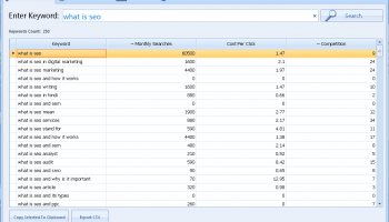 Keyword Research Tool is a small, lightweight program that discovers new Keywords that are easy to rank according to a keyword or topic you choose. In addition to keywords, you'll also see the monthly search data for each keyword returned, CPC, and the competition percentage. To use the software, simply enter a root keyword (ex. SEO) and hit the search button. The software will then talk directly with Google and pull up to 10 keywords per search. In minutes you'll have huge lists of keywords you can use for search engine optimization, pay per click, or any other purpose. These are the same keywords you'll see when searching directly inside Google, so you know they're commonly searched because Google displays them as suggestions to users. In addition, you can import a huge list of keywords to the application, and in one click you will see all the data for the keywords, so you can easily get the best keyword that fits you.