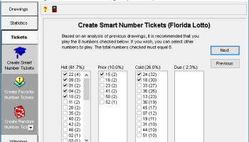 Works with all lottery games; Pick-3, Pick-4, Pick 5, Pick-6 and Pick-7 and Keno. Up-to-date drawing files for all United States and Canadian lotteries. Drawing files are also included for Australia, Brazil, Belgium, France, Germany,Greece, Hong Kong, Ireland, Malaysia, Mexico, New Zealand, Singapore, South Africa, Spain, Taiwan, Turkey and the United Kingdom. Drawing Files can be created for countries that are not listed. Easy to use - Program wizards guide you through all program functions and extensive online help is available if you have a question. Smart number option picks the numbers to play next based on the statistics for previous drawings. You also have the option to play your own favorite numbers or random numbers. Seven Statistical charts and 4 graphs are included for those players who prefer to pick their own numbers, rather than have the program do it for them. Maximizes your payoffs - Over 225 wheeling systems are included that maximize your payoffs through multiple ticket hits. Saves money - A filter option eliminates lottery tickets with unlikely number combinations. Filters can be applied based on the sum of the numbers or the number of odd and even numbers on each ticket. Saves time - Prints your tickets directly on lottery bet slips . There is no need to fill out bet slips by hand again! Prevents errors - Compares your tickets with any drawing date and shows a summary of tickets with winning numbers. An option is also included to record your winnings.