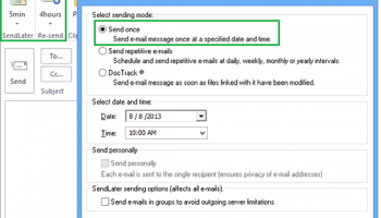 SendLater is free e-mail scheduler with a recurring email option. Prepare all your email notifications and reminders, greetings in advance and schedule their delivery. Each time you reply or create a new e-mail message, you will be able to choose a particular time for your PC to send your message. Just click the "SendLater" icon on the toolbar and select the sending time using time-and-date selector. Click "Send later" and your message will be scheduled for that time and saved in the "Send Later" folder. And at any time, you can open the "Send Later" folder and edit, remove or send your messages manually. Re-send email in case it was not responded and send repetitive emails until the response is received. Use SendLater Pro Edition to set up repetitive emails at comprehensive time intervals. Attach documents to the scheduled delayed e-mail with DocTrack feature. As long as your computer is online, your e-mail will be sent automatically even Outlook is not running. SendLater Pro Edition features: - Repeat your email until a response is received; - Re-send email in case it was not responded; - Send delayed or repetitive emails even if your Outlook is not running; - Attach documents to the scheduled delayed email; - Link a file or folder to a delayed email message to send the most recent file/folder version; - Delayed email messages will be sent automatically; - Use Send to send email messages from mailto links; - Send a delayed group message as a single email to all recipients; - A group message sent personally to a single recipient; - Split large recipient lists into smaller groups; - When sending recurrent emails you will be able to set path to CSV file and recipients will be loaded from that CSV file automatically. SendLater examples of use: - No more reminders needed. Schedule repetitive emails at comprehensive intervals. - Direct marketing letters and reports - Routine company meetings follow-up reminders - Never miss birthdays or other events.